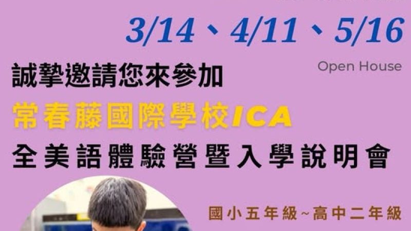 School News -February 9, 2026 Open House – March 14, April 11, May 16 開拓國際視野,全美語教學體驗營開課囉~~~~~ 全美語教學環境 English Learning Environment 全程外師教學 Certified Foreign Teachers 課程說明會開放登記 Presentation Register Now 登記資格 : 國小5年級~高中2年級 參加地點:台中市常春藤美式寄宿學校 課程時間: 第五梯次2026年3月14日 上午9:30-11:30 第六梯次2026年4月11日 上午9:30-11:30 第七梯次2026年5月16日 上午9:30-11:30 報名連結 :https://reurl.cc/6QlAAd 專人諮詢預約 :: https://line.me/ti/p/~@629thdpf 誠摯邀請您來參加,如有相關問題歡迎撥打:04-2539-5011 # 283 Other News and Events SCHOOL NEWS ATHLETIC NEWS OPEN HOUSE ALUMNI NEWS AND EVENTS LIBRARY NEWS